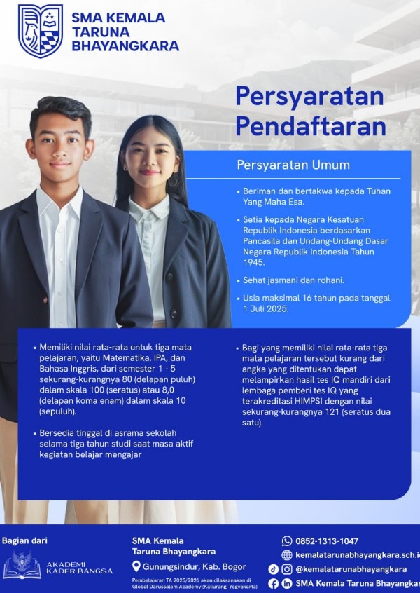 Kegiatan ini bertujuan memperkenalkan SMA Kemala Taruna Bhayangkara sebagai salah satu pilihan pendidikan unggulan dengan fasilitas dan kurikulum yang mendukung pembentukan karakter, prestasi akademik, serta nilai kebangsaan.